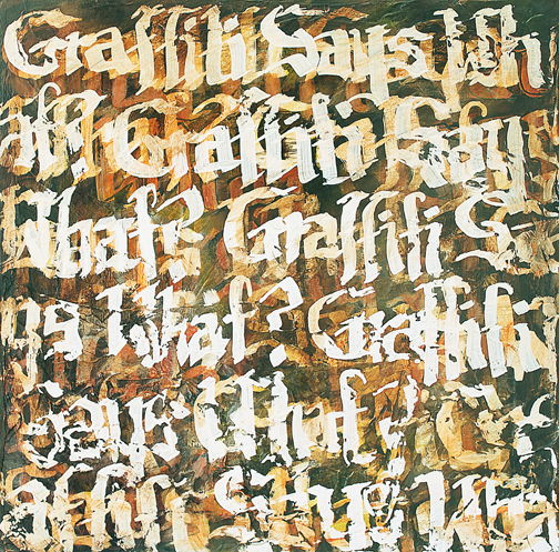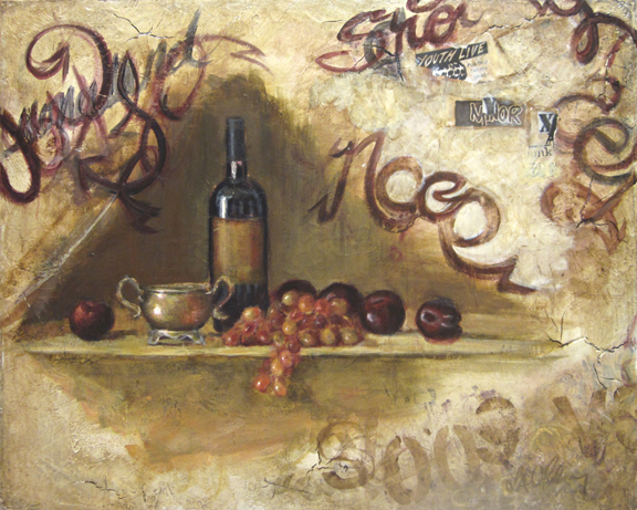 interior wall glazes and ornamental line elements of traditional painting, O’Riley saw a direct reference between graffiti work, modern murals and classical European and American murals and paintings. Her current series of paintings juxtaposes traditional still life and urban street art creating a narrative between the two art forms–and connecting